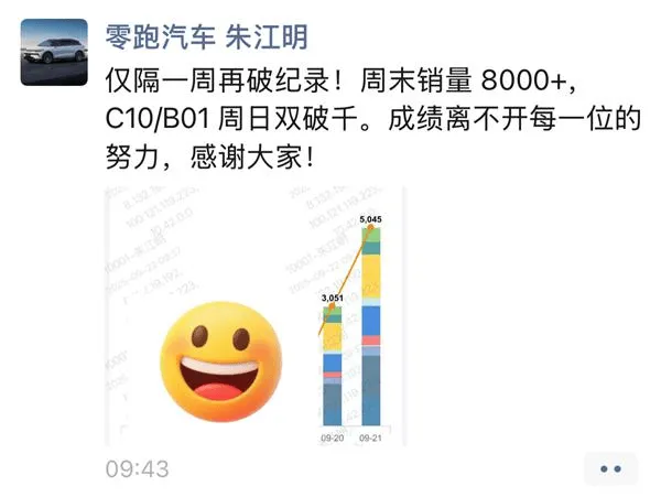 值得注意的是,本周一,零跑汽车创始人、董事长朱江明在朋友圈发文“秀销量”称,仅隔一周再破纪录,周末销量8000+,C10/B01周日双破千。