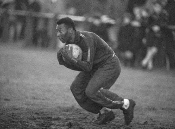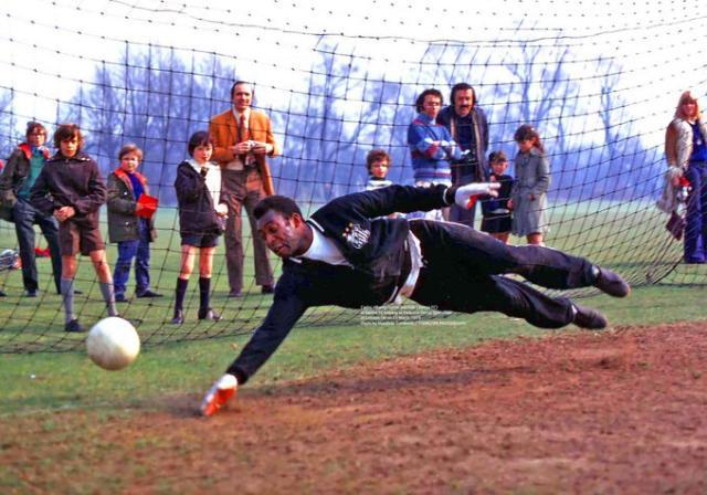 桑托斯和巴西队的训练中,贝利练习守门技术。